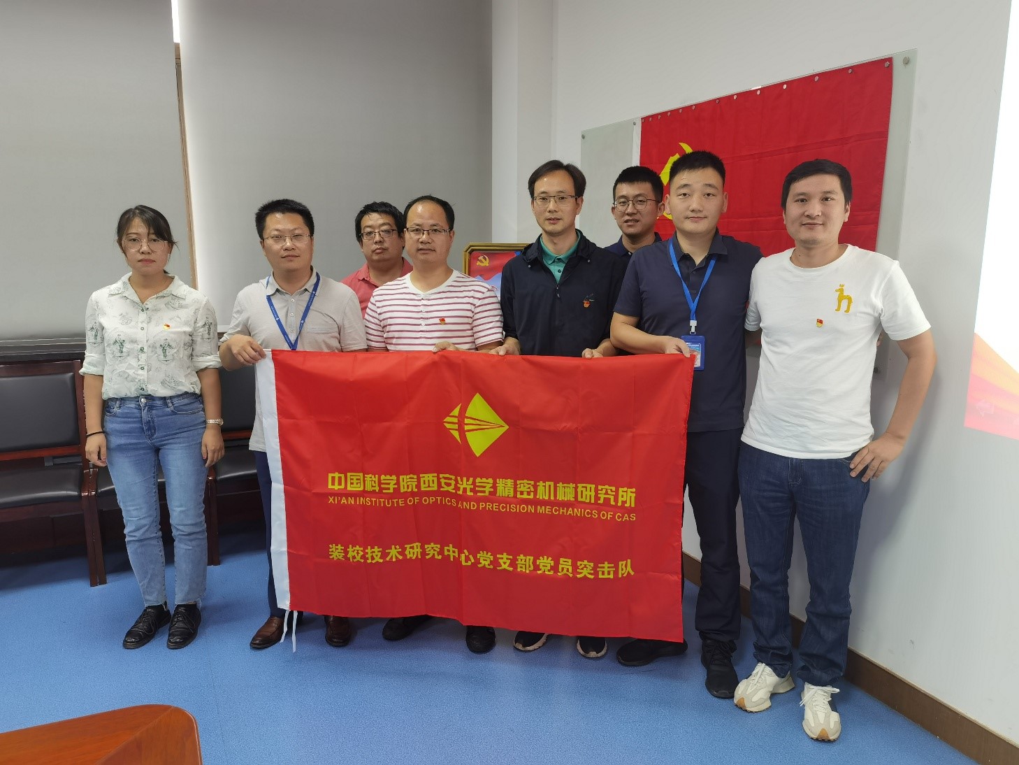座談會后舉行了“黨員突擊隊”授旗儀式。王鋒、葛永嬌、楊洪濤、郭高、康世發(fā)等分別為空間光學(xué)裝配團隊、大口徑光學(xué)裝配團隊及精密機械裝配團隊授“黨員突擊隊”隊旗,并向廣大黨員同志發(fā)出號召:希望廣大黨員強化責(zé)任擔(dān)當(dāng),攻堅克難、吃苦奉獻,真正起到先鋒模范帶頭作用,團結(jié)帶領(lǐng)組內(nèi)職工群眾,努力保證科研生產(chǎn),以一絲不茍的態(tài)度對待產(chǎn)品,高質(zhì)量按期完成任務(wù)。把學(xué)習(xí)黨史同推動科研工作結(jié)合起來,把學(xué)習(xí)成效轉(zhuǎn)化為工作動力和成效。